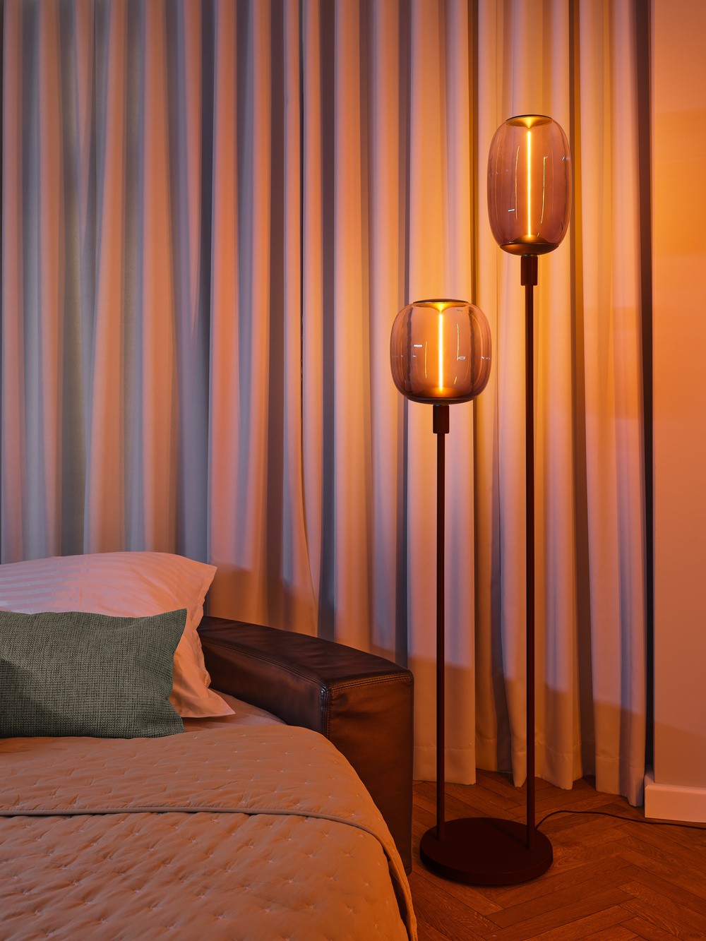 Jede Leuchte verfügt über einen integrierten Fußschalter, der eine komfortable Bedienung ermöglicht. Die Anzahl der Leuchtenköpfe – wahlweise mit einer oder mehreren E27-Fassungen – erlaubt flexible Lichtszenarien ganz nach Ihren individuellen Bedürfnissen. Kombinieren Sie die Leuchten mit dekorativen E27-Leuchtmitteln und setzen Sie elegante Lichtakzente in Ihren Räumen.